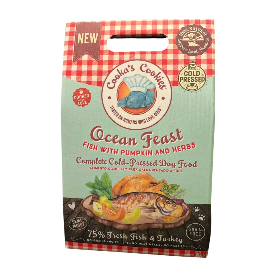 A Cooka’s Ocean Feast nem egy szokványos, extrudált száraztáp, hanem valódi, hidegen préselt eledel – friss halból és pulykahúsból, édesburgonyával, sütőtökkel, zöldségekkel és gyógynövényekkel, úgy elkészítve, hogy megőrizze a természetes tápanyagokat.
