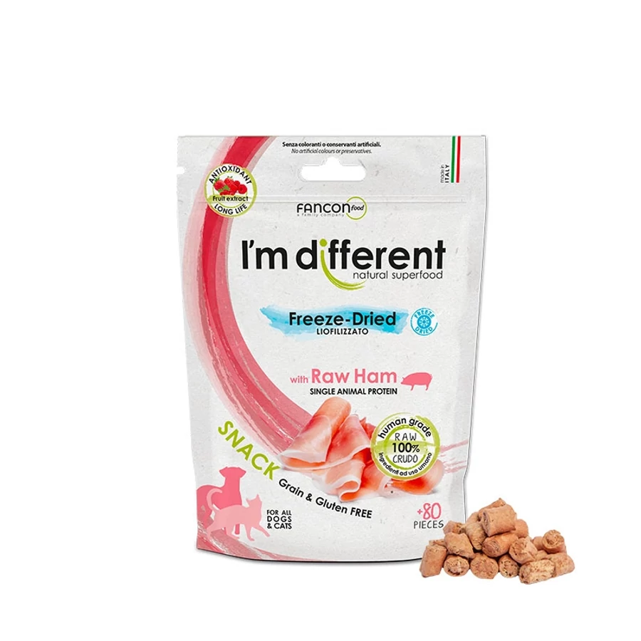 Az I’m Different® célja, hogy kitűjön a emberi fogyasztásra alkalmas minőségű összetevőkből készült fagyasztva szárított kutya- és macskaeledeleivel, amiket olasz emberi élelmiszer-előállító üzemükben állítanak elő.Ez azt jelenti, hogy kifejezetten szuperélelmiszereket gyártanak 80%-ban valódi emberi fogyasztásra is alkalmas húsból vagy halból. Az egyfehérjét tartalmazó receptjeik ízletessége néhány különlegesen megválasztott összetevőkben rejlik, ettől ellenállhatatlan minden négylábú számára.